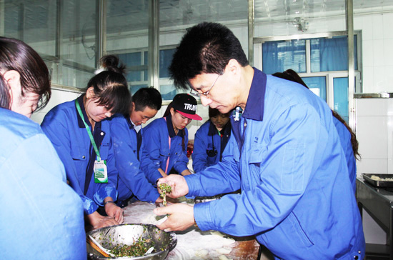 演出快要結(jié)束時(shí),數(shù)十名志愿者又轉(zhuǎn)移到了廚房,開始包餃子,大家卷起袖子,搟皮的搟皮,包餡的包餡。公司領(lǐng)導(dǎo)莊總也與志愿者們一起投入到了包餃子的行列中。